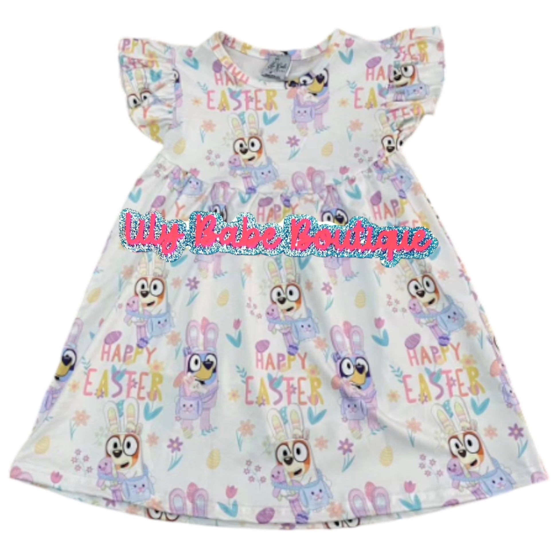 Blue Pups Bunnies White Dress